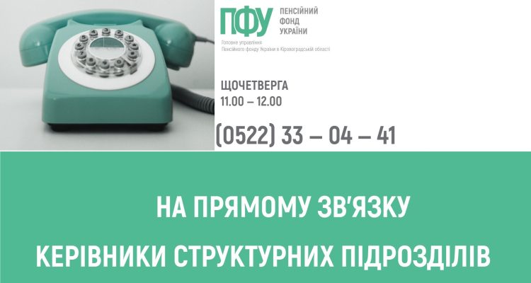 Щочетверга з 11.00 до 12.00 у Головному управлінні за номером “гарячої” телефонної лінії (0522) 33-04-41 роз’яснення та консультації з питань, що належать до сфери діяльності Пенсійного фонду України, надаватимуть керівники структурних підрозділів:
