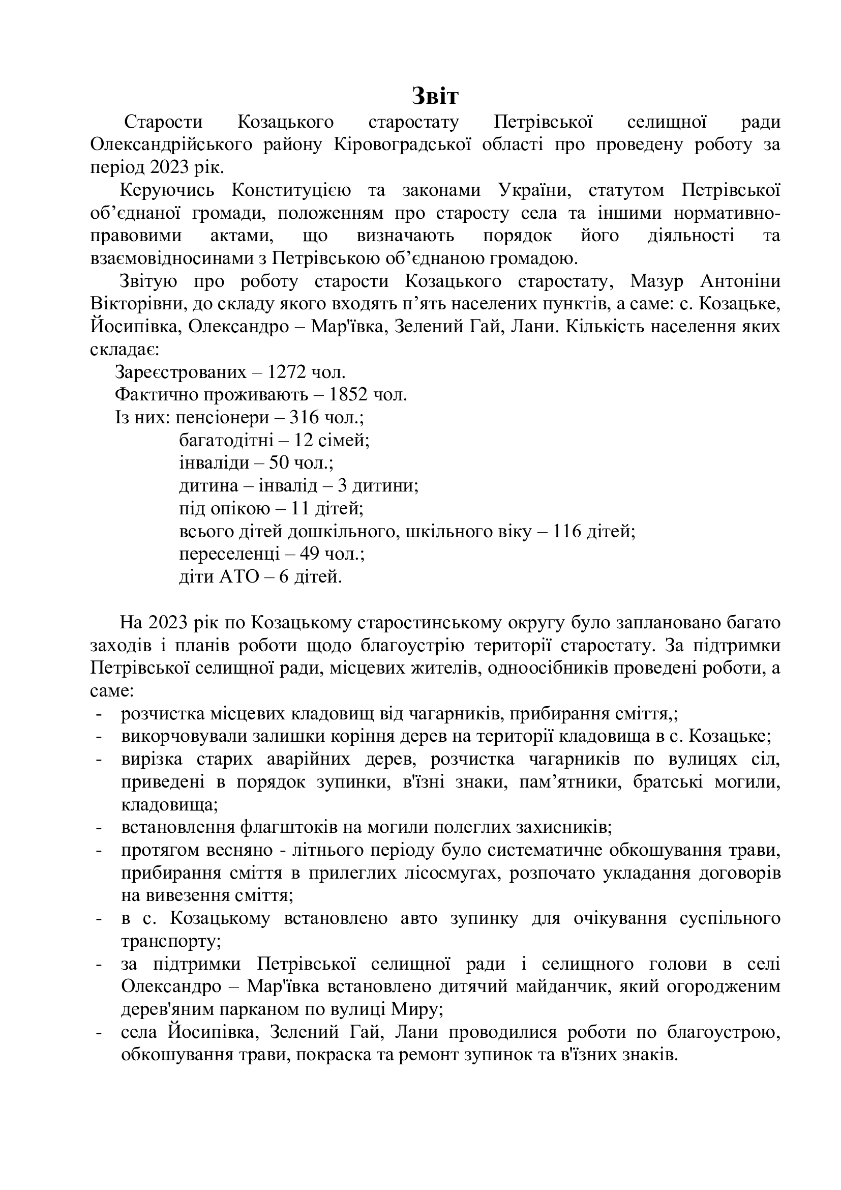 Звіт старости Козацького старостату Петрівської селищної ради Олександрійського району Кіровоградської області про проведену роботу за період 2023 рік. Петрівська селищна рада Консультації з громадськістю 19.03.2025