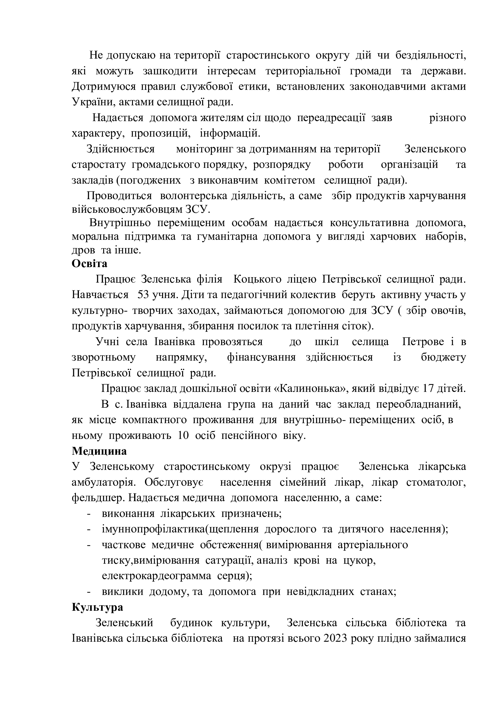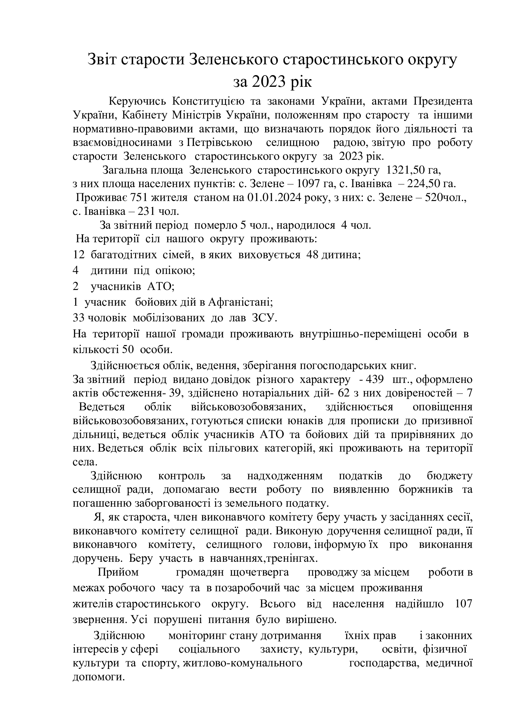 Звіт старости Зеленського старостинського округу за 2023 рік Петрівська селищна рада Консультації з громадськістю 20.03.2025